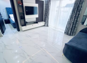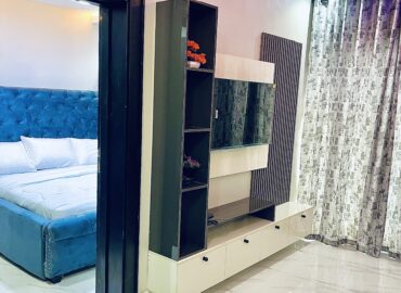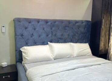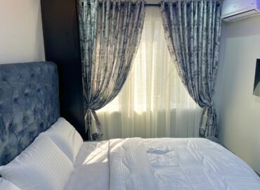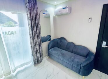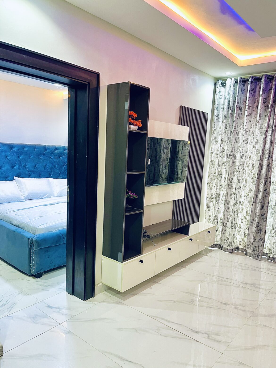 Experience comfort in a spacious bedroom with a king-size bed and separate living room.